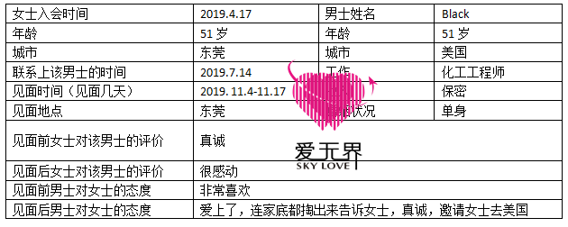 范姐尝试了,她收获了惊喜,2019年11月4日,女士和来自美国的男士Black结缘东莞。