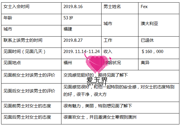 Fex来自澳大利亚,以前从事财务工作,退休后有丰厚的退休金,男士很喜欢中国女士,在平台上,他是这么介绍自己的择偶标准的,“我希望能找到一位懂我、爱我的中国女士,和她一起走进婚姻殿堂。”阿里红娘把他推荐给Q女士。