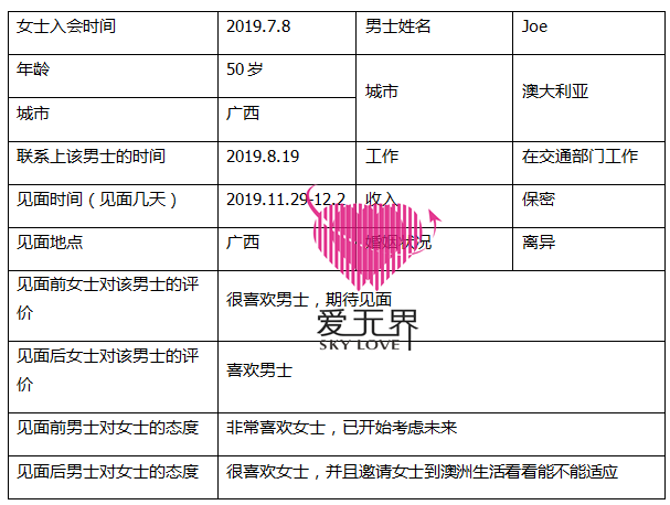 相聚的时光总是那样充实而短暂,12月2日,Joe就要回国了,他非常舍不得离开Mary,还没分开,就已经很迫切的希望Mary能赶紧办理好澳洲签证了,Joe还说,他将会过来中国亲自接Mary去澳洲生活一段时间,看能否适应澳洲的生活,他很期待两人再次相聚的那一刻。