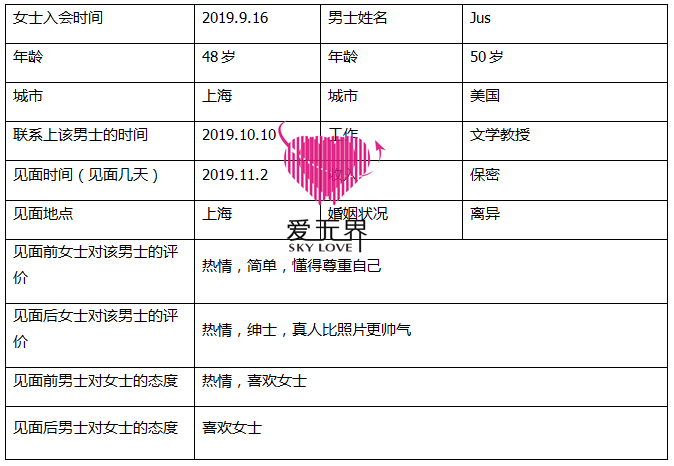刘女士深谙其道,在追爱的路上,从不放弃每一次和西方男士见面的机会,不放弃每一个能够自我提升的情缘,2019年10月,她在阿里红娘邂逅美国文学教授Jus。
