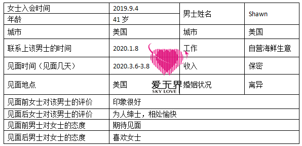 在入会阿里红娘以后,张女士收获到了很多男士的追求,和不同的男士约会见面,有教练从旁指导张女士才能避免当局者迷,才能更清醒的去对比每一位男士对自己的用心。每一次见面都能让张女士享受恋爱的感觉,同时能保持冷静的心态和教练一起分析,不急不躁,2020年1月8日,她和另一位男士Shawn相遇了。
