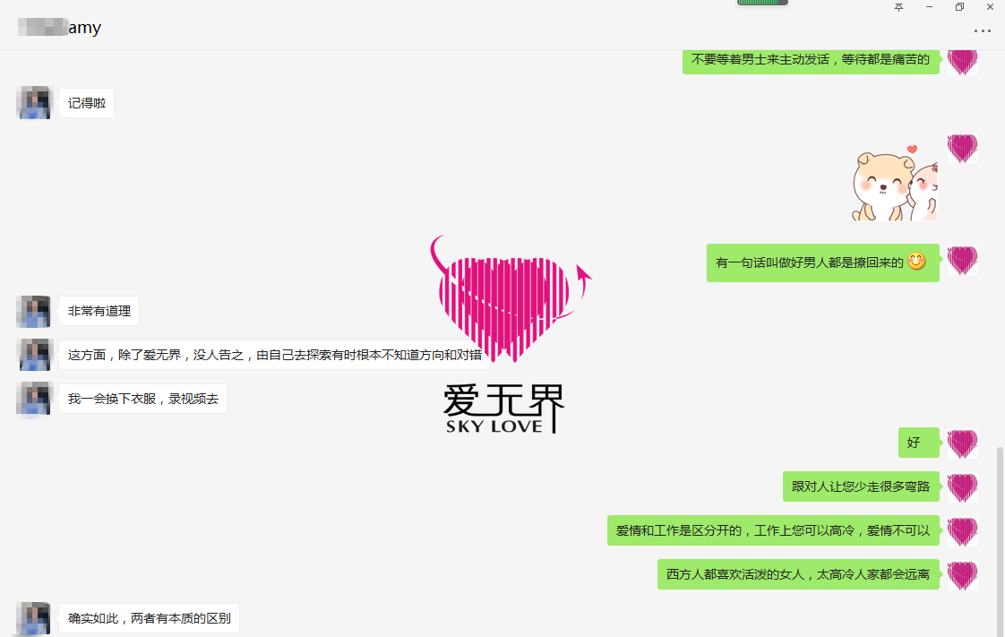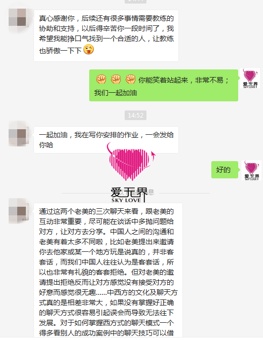 在李女士和西方男士谈恋爱的过程中,阿里红娘教练一步一步带领着李女士和男士从认识开始一步一步深入发展感情,告诉李女士每一步具体要怎么做、该如何和西方男士交流、怎样判断男士对自己喜欢到了什么程度、用什么技巧才能俘获西方男士的心等等,从方方面面为李女士的跨国交友之路保驾护航,带领李女士成就自己的跨国交友梦,成长为一位情商与魅力兼备的女性。
