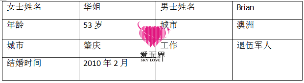 华姐是在10年前从阿里红娘嫁到澳洲的。刚刚入会时,华姐看起来黝黑黝黑的,留着一头干净利索的短发,性格开朗自信。搭上阿里红娘这辆快车,华姐在跨国交友的路上乘风破浪,接连收获了三位男士的猛烈追求,每天都能收到一大波情书,最后华姐在众多追求者中选择了Brian。