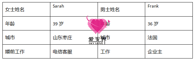 在教练的指导下,两人感情渐渐升温,并携手步入婚姻殿堂,还生下了一个可爱的混血宝宝。虽然是二婚,但Sarah却觉得在阿里红娘找到的这个伴侣才是自己真正想找的丈夫,Frank英俊帅气,人品极好,对感情真诚,丝毫不介意她单亲妈妈的身份,反而给予女士无边的宠爱。