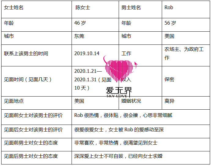 他们的心越来越近,Rob无时无刻不在思念着陈女士,无时无刻不渴望和陈女士有一次真实的见面。而陈女士也希望能见到Rob同时能看一看男士的家。2020年1月22日,陈女士搭上了去美国的飞机,两人相见的那一刻,Rob激动不已,紧紧地拥抱着陈女士,彼此都非常开心和满足。