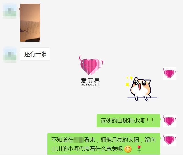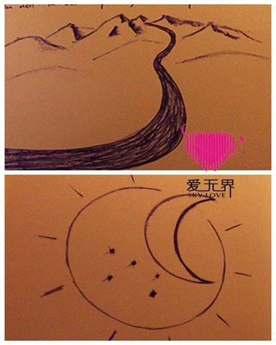 除了文字,Angus还在纸上画画:太阳与月亮相拥、沙漠与河流的交汇......就像金女士和Angus,虽然在不同的空间,但因为相爱,就能拥抱在一起。