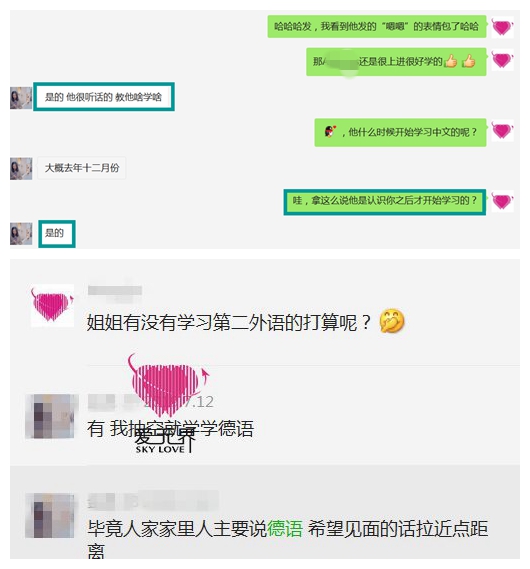 金女士和Angus是为了更融入对方世界而努力提升自己的一对。Angus为了和女士沟通,下载了APP学习中文;金女士为了和男士家人见面时能更亲近,在空闲时间学习德文。他们都没对对方提过学二外的要求,但两人都为了他们的浪漫爱情而默默努力。
