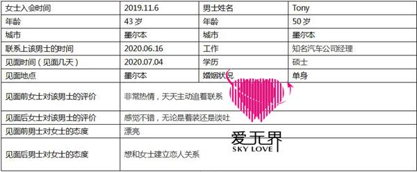 在服务组的帮助下,陈女士交流的澳洲男士有很多,Tony却是那个让陈女士有好感的男士之一。他们的相识就像是神的旨意,一切都刚刚好。