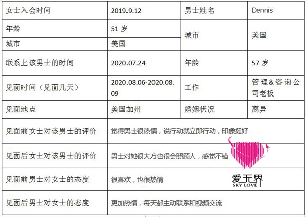 找到最合适自己的人需要不断对比,正式确定一段关系亦需要时间。赵姐和Dennis已经达成共识,两人再相处和了解彼此一段时间,同时也在着手准备下一次Dennis飞过去新泽西的时间及具体事项。阿里红娘国际交友网也会持续跟进两人的(恋情)发展,并继续为赵姐的爱情出谋划策。国际交友咨询专家阿里红娘提前恭贺赵姐和Dennis成功。