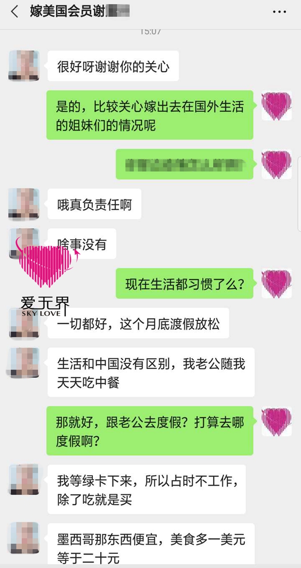 当我们询问嫁到美国的成功会员时,谢姐的答案是:和中国没有区别。谢姐现在和丈夫生活在美国,生活和中国没有区别,丈夫就随着她每天吃中餐。对于他们而言,连饮食差异都是不存在的。