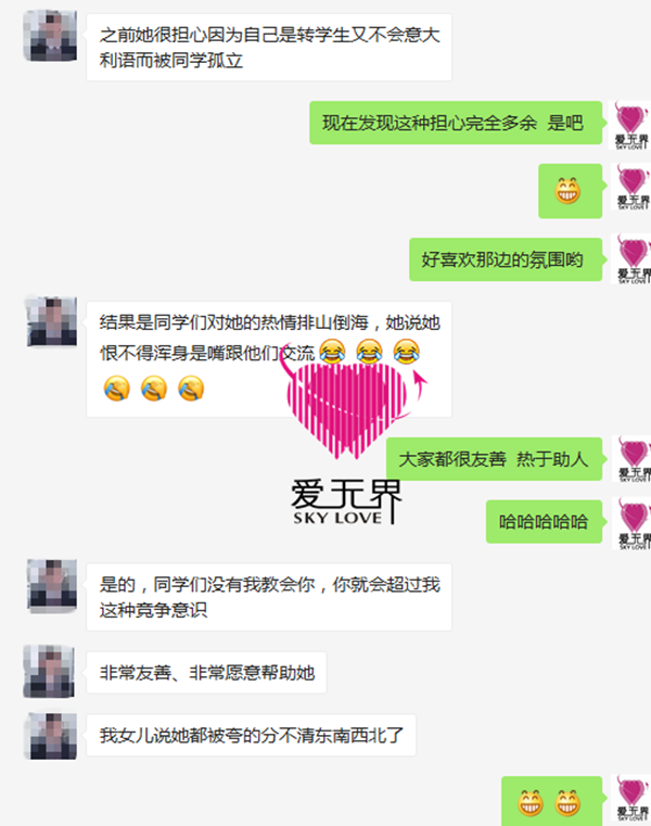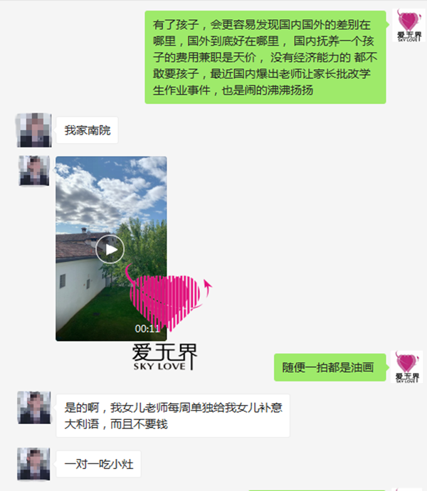 带着女儿外嫁的成功会员陈女士的答案是:看到女儿肉眼可见地变得开朗,我就知道我嫁对了。去意大利之前,陈女士和自己的女儿都有过担忧,害怕是转学生又不会意大利语而被同学孤立,结果同学们非常乐意地和这位新来的小同学交流,还热情地教陈女士的女儿意大利语。