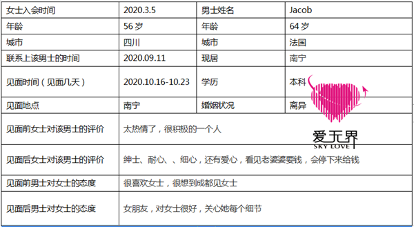 全女士来自四川成都,性格开朗,对即将到来的感情充满着期待。每一次,情感老师为她匹配到的男士,她都会积极和对方交流。因为勇于尝试、因为乐观、因为信任情感老师好,很快她就在阿里红娘国际交友上遇到了同样热情善谈的Jacob。Jacob来自法国目前在南宁生活,和全女士的相遇就像久别重逢的知己,在聊天中碰撞出爱的火花。