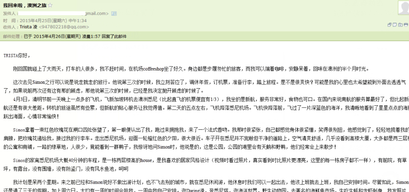 我加入你们之前以为你们只做澳洲,现在懂了,澳洲真的是生活的天堂,这里很多中国人,多得超出你想象,看到的亚洲人几乎都是中国人,普通话,广东话,各地方言,我几乎真的以为我不是在澳洲,开始几天去的旅游景点停满了载中国人的大巴,鱼市场里更是挤满了买海鲜的中国人,我再次以为自己到了深圳的海鲜批发市场,连Simon都大声对我喊:Wellcome to China!!!