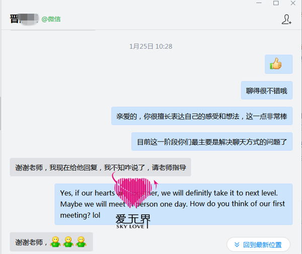 阿里红娘的服务团队就一步步带领着晋女士探索两性间相处的技巧、针对性地传授与西方男士的沟通方式以及如何用更好的措词去询问对方的情况。