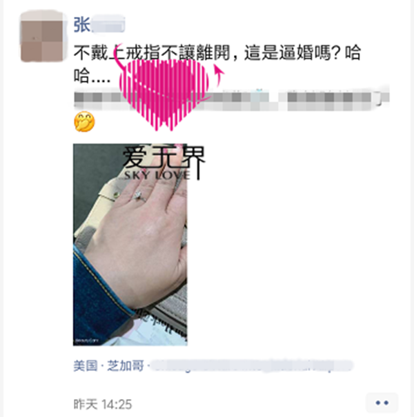 春天给人以新的开始,新的收获,新的希望,在这温暖的三月,张女士也收获了新的惊喜,被Bin用戒指套牢啦。看到张女士被求婚的消息,阿里红娘都为此欢呼。