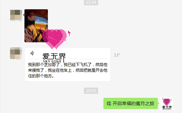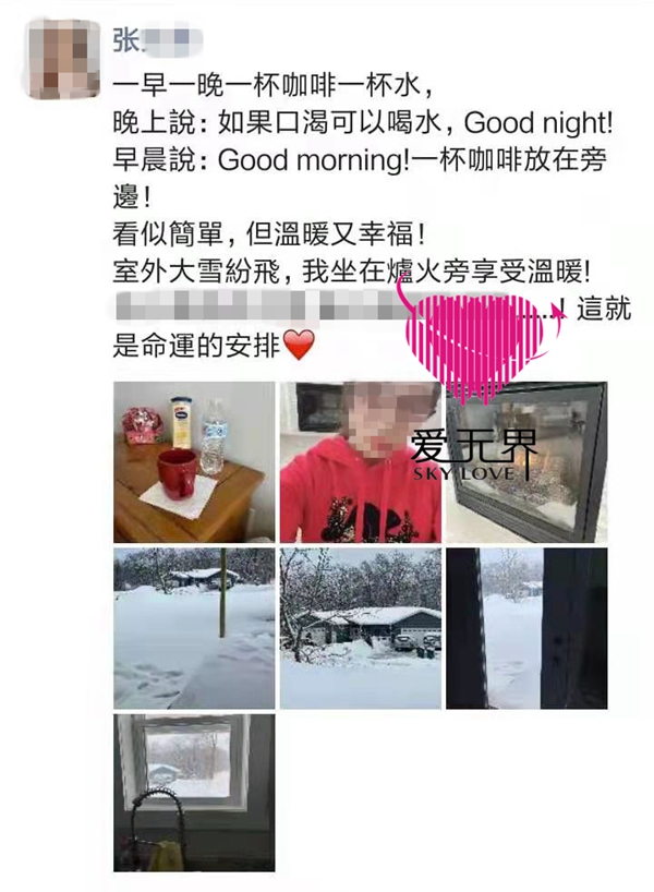 第二次见面后,张女士和Bin就进入了热恋期。张女士会到芝加哥和Bin一起游玩;Bin对张女士就像照顾小孩子一般,温柔宠溺、体贴入微。每天早上张女士还睡眼惺忪时,Bin已经为她冲泡好了咖啡;而晚上入睡前又会准备一杯水。这些琐碎而温暖的细节,让张女士感受到自己一直被爱包围着,体会到了家的温馨、家的美好、家的幸福。