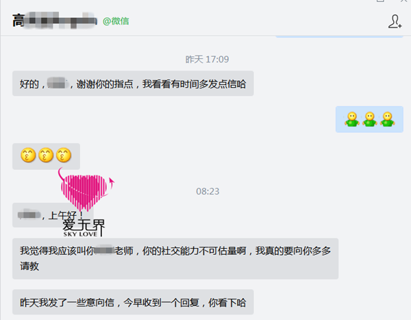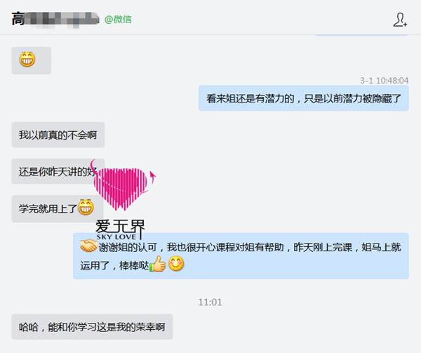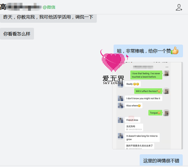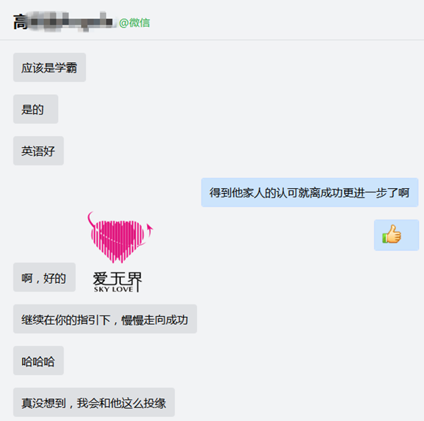 在实操的过程中,高女士就发现她难以甄别每位男士的真诚度,也不懂得如何和心仪的男士聊天。而这些,就是阿里红娘指导的价值所在。老师按着先前根据高女士的情况定制的方案,给她上了甄别筛选课程、聊天技巧课程...高女士也开始全心全意地跟着老师的步伐,把每次课上学到的内容自己运用到实践之中。有时也会有不知道该怎么聊的情况,高女士就会截图保存询问老师的意见。高女士也直言在上完聊天技巧课程后收获很大,从以前完全不懂得表达自己关心人,到现在连调情都学会了。