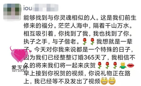 很多人会说浪漫、仪式感这些只存在于追求的阶段,但在西方人眼中、在他们这里,是无论过了多久都不会改变的。对订婚一周年,唐先生是非常的郑重其事。一大早,唐先生就第一时间送上了祝贺视频,把当下的心意和G女士分享;而在此之前,唐先生还提前准备好了礼物,算准了礼物到达的时间,给G女士惊喜。