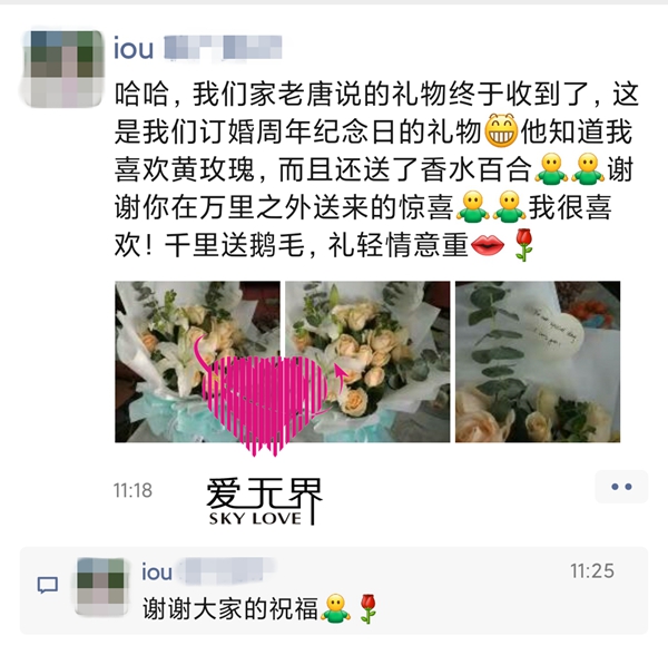 中午前,唐先生预先订购的鲜花被送到了G女士的身边。黄玫瑰,是G女士喜欢的品种,香水百合,又有伟大而纯洁的爱之意。如G女士所言,“千里送鹅毛,礼轻情意重”。这束花束,不仅是两人共庆一周年的礼物,还蕴含了唐先生对G女士的用心和承诺。
