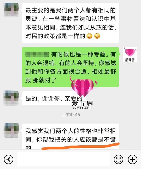情感老师对会员是跟进得比较紧的,聊天时G女士如果有忽略的地方,情感老师都会及时提醒G女士要给对方更多正面的、及时的互动反馈。同时情感老师也会指出G女士存在的问题,帮助其进步:在和异性交流时,我们应该弄清楚并坚持我们的原则线,不卑不亢地和对方交流,当实在不喜欢对方提问的问题或行为时,可以明确地说不。