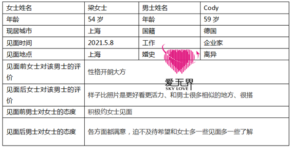 梁女士有学识,有内涵,在上海有着优越的生活质量,希望可以找到一个和自己在精神上有共鸣,各方面匹配的男士。于是,她遇到了目前在中国公干的德国的企业家——Cody,一位与她门当户对的男士。