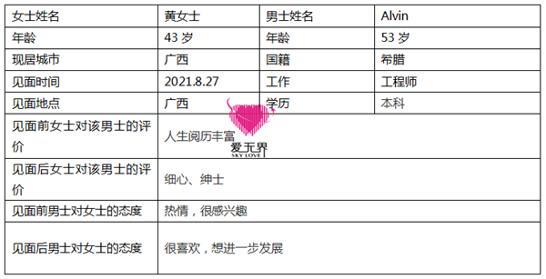 经过这次见面后,黄女士发现和外国人沟通其实并不难,勇敢地开口表达自己,在有需求的时候还可以用body language也完全没问题。放松心态,更能享受约会的美好,亦发现了Alvin风趣幽默的一面,在见面聊天中不断被他逗笑,原定的一起喝杯咖啡,最后又一起去吃晚饭,又又去江边看夜景,依依不舍,还未分别,已经开始想念对方。