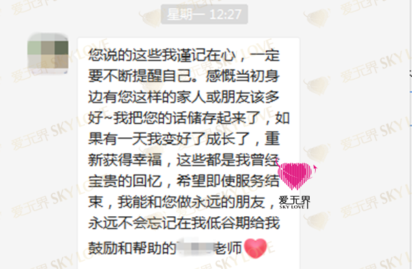 刘女士也很感谢情感老师的付出,对陪伴自己的老师毫不吝啬称赞。她也很配合老师的服务、愿意听取建议,学习着去调整心态、提升外形、不断去检讨自己的聊天方式、方法。而当刘女士变得乐观积极,用心、花精力去交流,效果是很明显,吸引了不少优质男士的示好。
