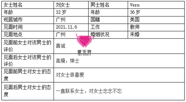 在一天又一天的交流中,她越发感受到Vern的态度很真诚,和之前遇到的前男友是完全不同的。在Vern的邀请和情感老师的鼓励下,刘女士也踏出了第一步,决定和Vern见面。