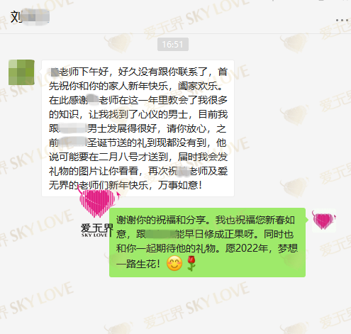 而这些,都是刘女士在情感老师身上学到的。“授人以鱼不如授人以渔”,情感老师提供的不仅仅是适用于当下,而是终生有用的技巧和方法,让姐妹们无论何时何地,都懂得如何去经营一段感情。刘女士对阿里红娘的服务和情感老师非常认可,和Ben的近况很愿意和情感老师分享,在节假日还会送上祝福。