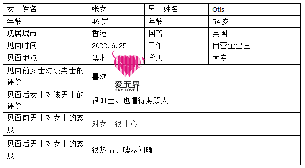 见面对象Otis是英国人,现在澳洲生活,并在那拥有了自己的汽车维修店,没有经济压力,又懂得享受生活,是一位很有闲情逸致的男士。Otis喜欢享受浪漫,张女士同样是个浪漫有仪式感的人,两人志趣相投,每天都聊得火热,恨不得早点见面对方。
