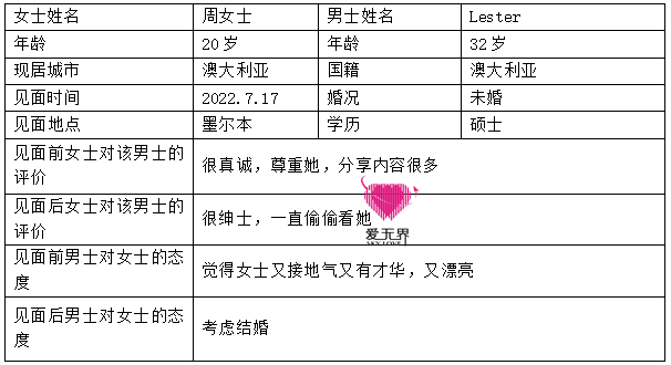 第一次的见面非常顺利,周女士踏出了一步,累积了更多约会经验。分别后,周女士问及Lester的感受时,Lester又开启了“夸夸模式”,夸周女士真人善良又有魅力,也很认真地表示自己很喜欢周女士,见面后考虑了结婚。