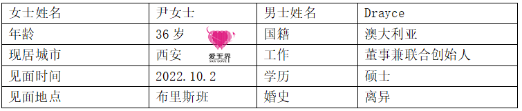 尹女士谈吐大方,可以用英文简单交流,短短的一次见面,就给Drayce留下了深刻的印象。Drayce对尹女士很有好感,一直和她保持着电话联络,期待着下一次的见面。