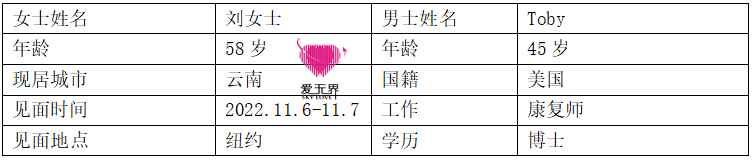 222年11月6日,Toby开车来到纽约,和刘女士见面。见面的效果完全出乎刘女士意料之外,Toby非常绅士,有风度有教养,又懂得照顾人,和他在一起的每一刻都觉得幸福,刘女士觉得从来没有一段关系让她感觉如此的温暖。