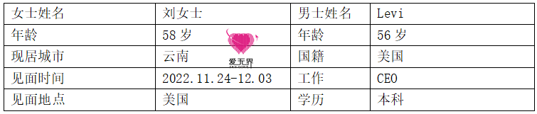 Levi来自美国,56岁,是一位CEO,精明能干,绅士多金。和Levi相处,刘女士总能感受到他的真诚。在交流之初,Levi就主动和刘女士交代了自己的情况,包括情感经历、孩子、房子情况等等,甚至将自己的护照都发给了刘女士。
