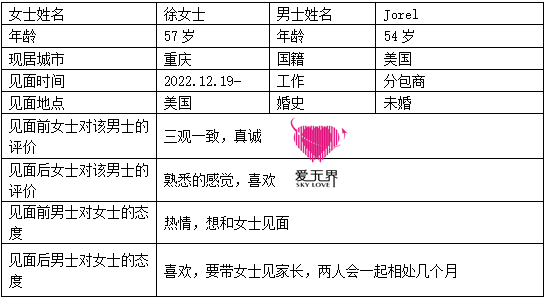 徐女士和Jorel感情相通,目标亦一致。以结婚为前提的见面,让徐女士有些紧张,情感老师做了详细的见面攻略,徐女士都一一记了下来。一直以来,徐女士都很信任并感激情感老师,和Jorel交流时,她遇到的问题都会来寻找情感老师解惑,情感老师也会根据徐女士的情况,给予她指导和建议。