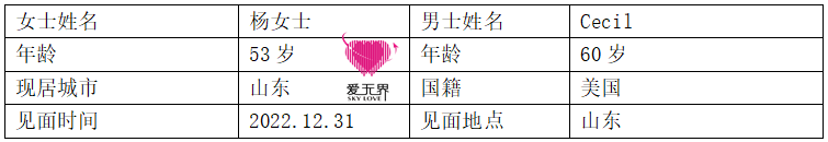 美国男士Cecil,60岁,礼貌真诚,对杨女士很是热情,经常主动和她聊天。感情也在这一天天的联系中加深,在2022年的最后一天,有仪式感的Cecil邀请杨女士见面,和她一起度过。