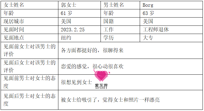 2023年2月25日,Borg在约定的见面时间来到图书馆,接郭女士一起去约会。在见面的那一刻,郭女士瞬间感觉到爱情的火花在两人之间点燃了,他们都发自内心地对对方产生倾慕。外国男士真的不擅长拍照,真人比照片帅气很多,也很有亲和力。