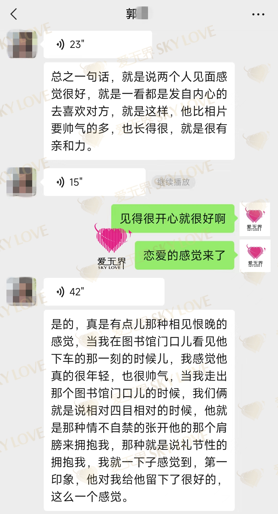 在刚来到阿里红娘的时候,郭女士很易焦虑,导致见面和邀约都不太顺利,让她有些心灰意冷。每一朵花开都需要用时间浇灌,结果来临前要一步步积累,没到最后都不要轻易放弃。情感老师纾解郭女士的情绪,一直和她沟通择偶要求和西方文化冲突的地方,一句一句带着她和男士交流。