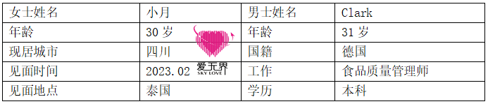 小月妹妹来自四川,30岁,是一位老师,经历过一段失败婚姻的她没有放弃追求幸福,重新出发,遇到了德国的食品质量管理师——Clark,31岁。