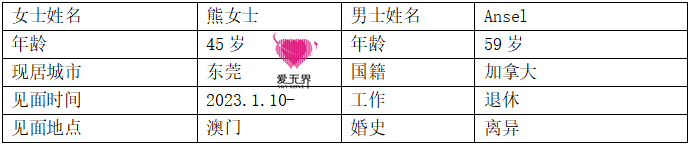 熊女士出生于湖北,在东莞生活和工作,45岁;Ansel来自加拿大,59岁。他们邂逅于22年4月份,热情奔放的Ansel和善良纯朴的熊女士在网上结缘,互相吸引。