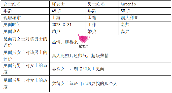 2023年3月下旬,许女士按原计划飞去了澳大利亚。Antonio得知这个消息后非常开心,主动约许女士见面。那时许女士忙着和家人会面、聚餐、办理个人事务,Antonio也很理解,告诉许女士,方便的时间和自己见面就行,他会一直等着她。