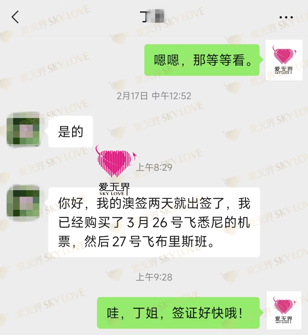 在2023年2月下旬,丁女士提交了澳洲签证,两天快速出签。丁女士当下就购买了3月26号飞悉尼的机票,无论是她,还是Brady,都对接下来的见面充满了期待。