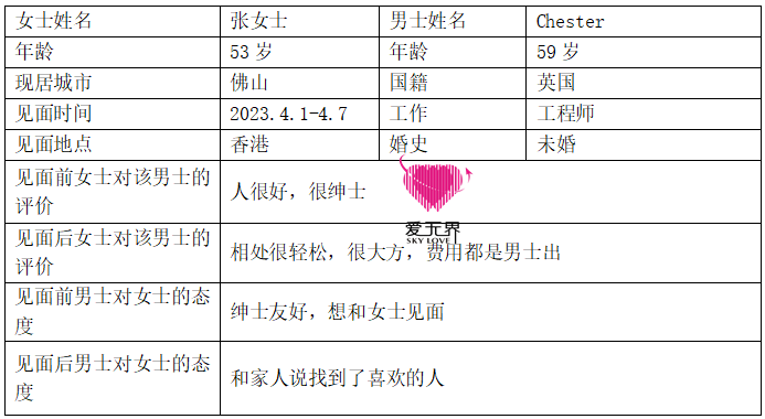 目前Chester已经回国,他很喜欢张女士,会和自己的家人介绍张女士,期待两人之后的发展~