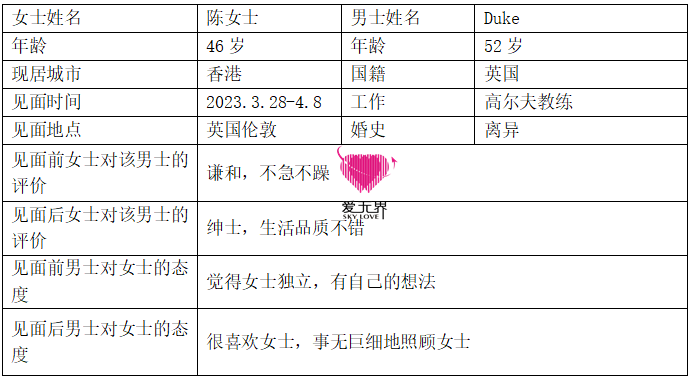 2023月3月28日,香港的46岁陈女士飞到了伦敦,和52岁的英国高尔夫教练——Duke见面了,我们一起来看看情感老师是如何给予指导的。