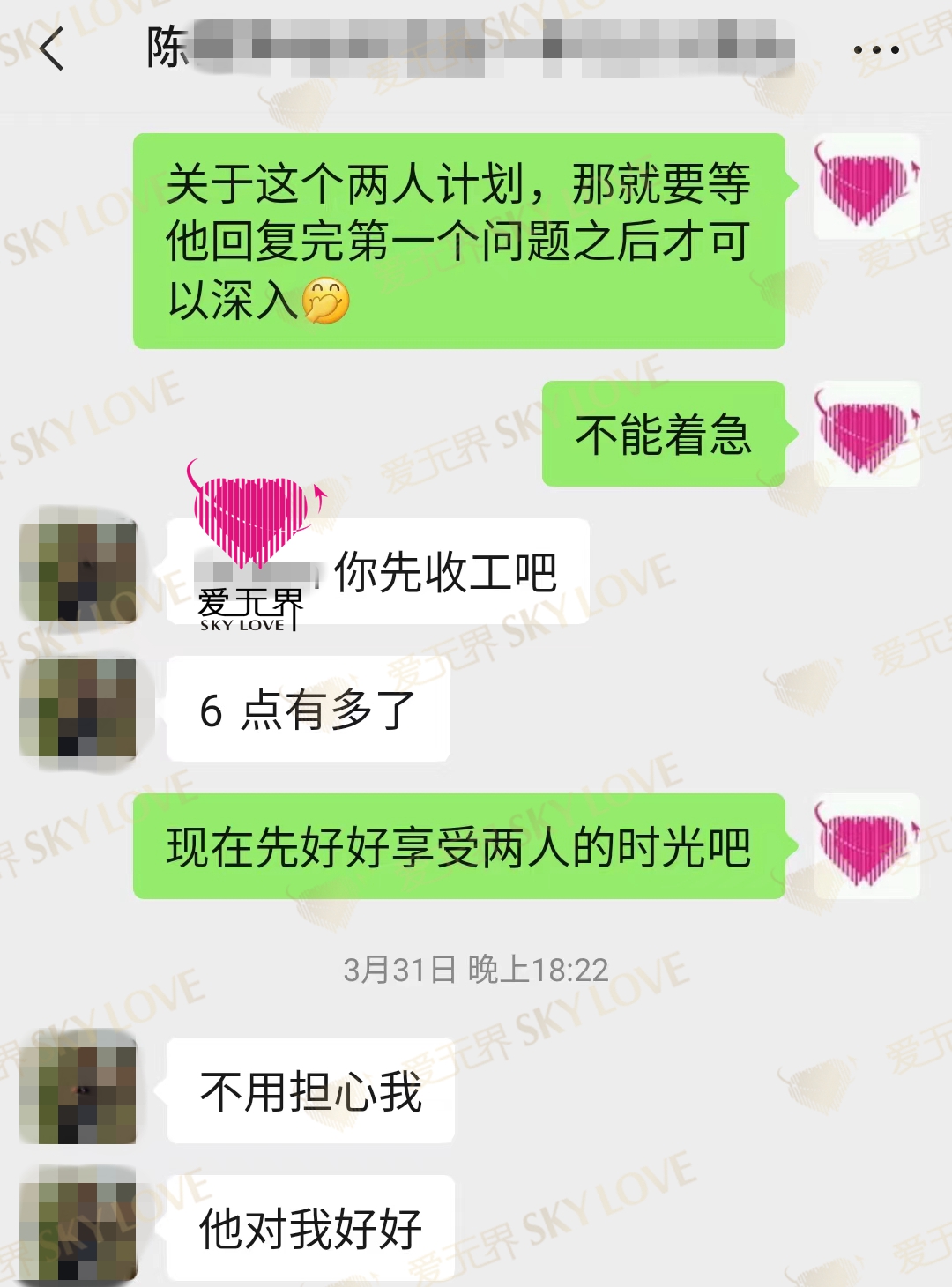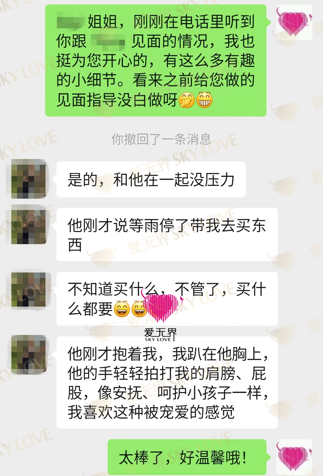 在这过程中,情感老师依然密切关注着陈女士见面的情况,及时为她解决问题,教她如何去引导升级两人的关系。