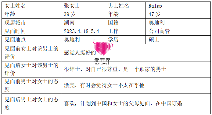 Ralap来自奥地利,47岁,在一家公司任职高管,硕士学历,博学多才。两个人相识于2022年12月中旬,Ralap喜欢张女士,会主动分享自己的工作和生活环境的照片给张女士,邀请她视频,也会去了解张女士的想法和个人、家庭情况、中国文化等。