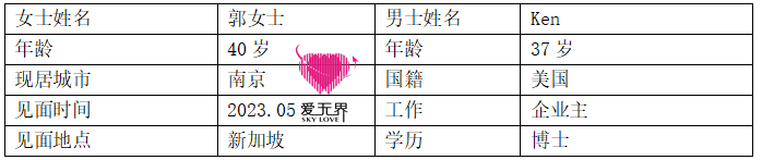 南京的郭女士,40岁,从事会计工作,性格随和、乐观、上进。来到阿里红娘之后,郭女士跟着情感老师不断提升自己,改造自己的外形,修养内在,更懂得展示自己的魅力。变得越来越自信、漂亮的郭女士吸引了许多男士的目光,其中一位就是Ken。
