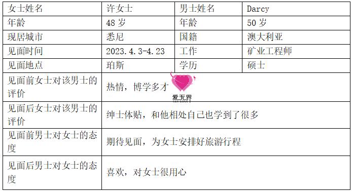 2023年4月3日,许女士到达珀斯与Darcy见面。