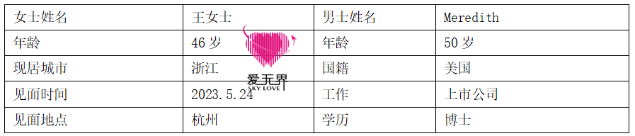 Meredith来自美国,50岁,是一位非常绅士,智慧、热情的男士。他对王女士一见钟情,主动和她打招呼,和她分享自己的生活和工作。Meredith告诉王女士,他目前在一家上市公司工作,博士学历,希望和王女士有更多的发展。