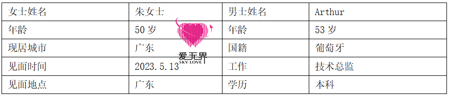 Arthur是一位来自葡萄牙的男士,53岁,工作是技术总监。他是一个宽容、自由的男士,在和他交流中,朱女士也慢慢放松了下来,去享受这个过程。